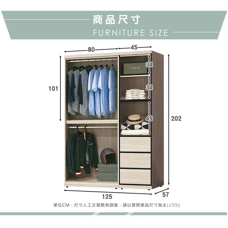 ◆尺寸:寬125x深57x高202cm
