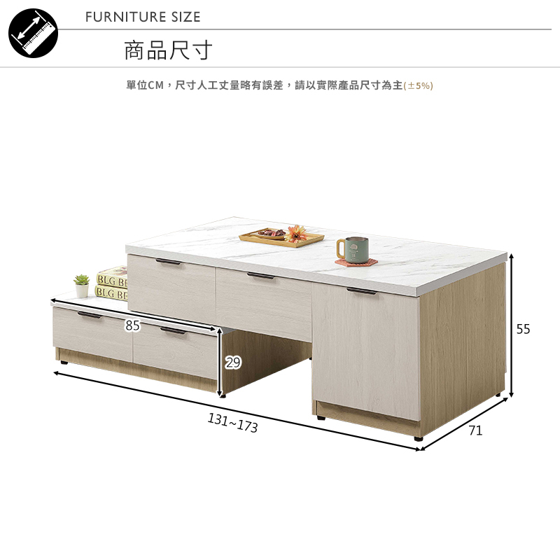 ◆尺寸:寬131~173x深71x高55cm